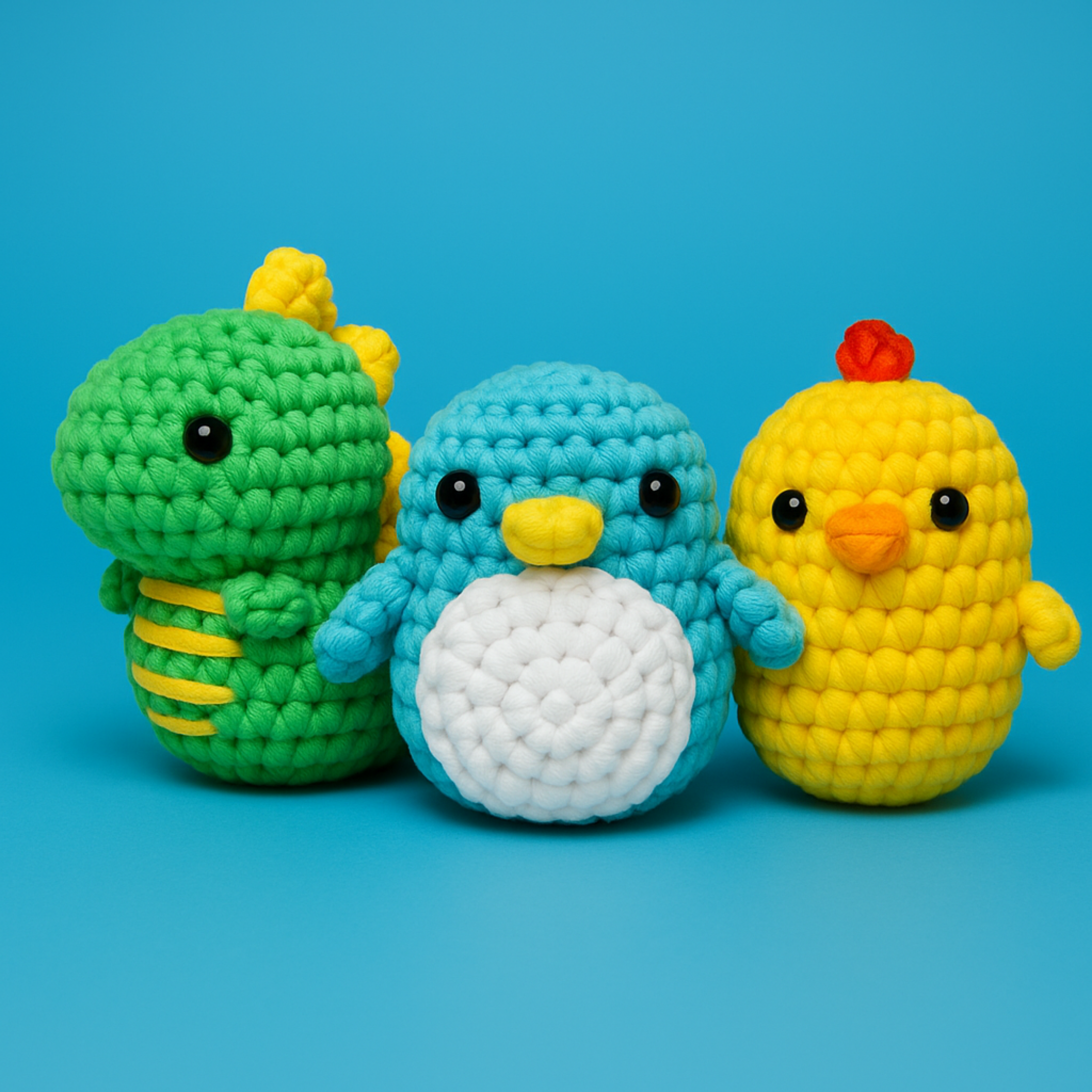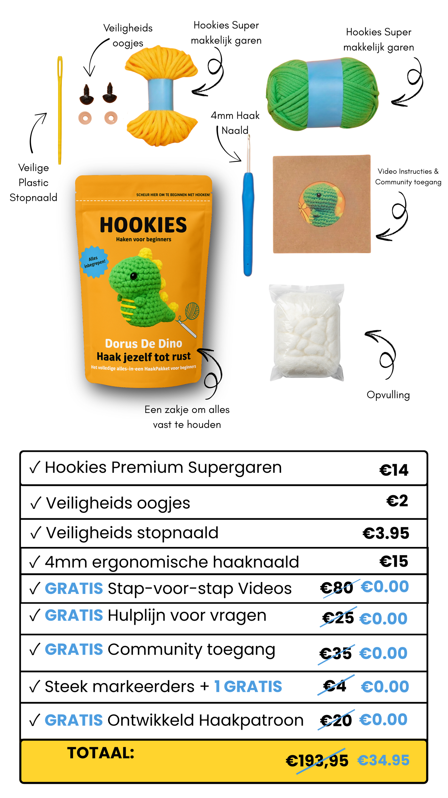 Je kunt gewoon vanaf nul beginnen — we leren je alles stap voor stap. In je pakket zit alles wat je nodig hebt, van haaknaald tot instructievideo.
